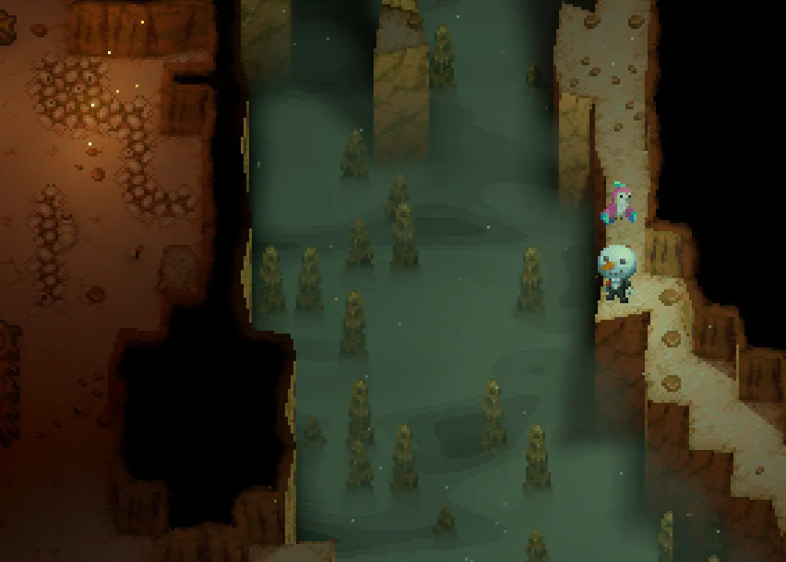 A pit is any location not being occupied by a ground block or liquid. Pits can be filled in with ground objects, or created by digging ground up; pits can also be filled in with an liquid. Bridges can be used to cross pits without damaging any decorations found within.